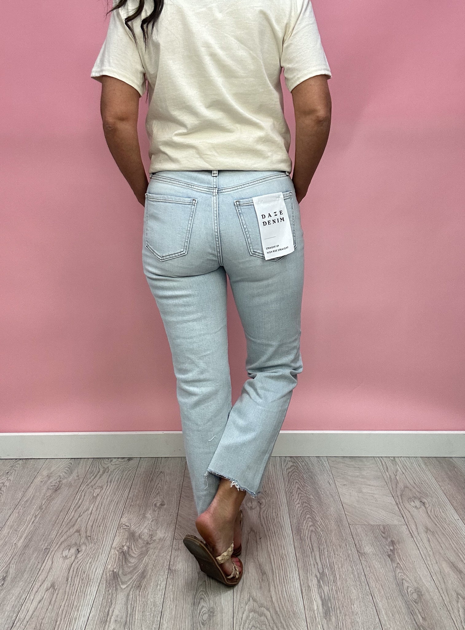 The jean that does it all—meet the Daze Denim Straight Up in Swoon Vintage. With a classic straight leg that tapers just enough at the ankle, plus a scissor-cut hem and light distressing on a dreamy light wash, this pair is your go-to for cute everyday clothes that still feel a little edgy. Made from Daze’s Just Right fabric, this denim has the perfect mix of rigid and stretch—comfortable cute clothes that move with you but keep their shape (yes, please!).