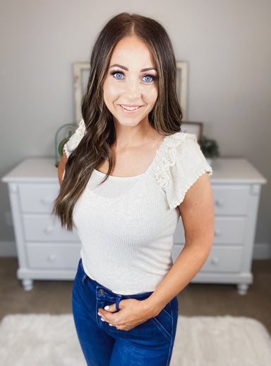 This Melina Ribbed Lace Flutter Sleeve Top is classy. The flutter sleeves overlayed with lace brings such a gorgeous, yet subtle detail. Pair it...